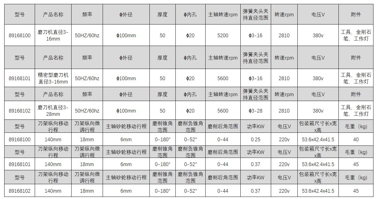 订货号 制造商型号 输入功率 空转转速 刀头行程 夹头尺寸 重量 ɸ外径 厚度 ɸ内孔 主轴转速 弹簧夹头夹持直径范围 刀架纵向微调行程 主轴砂轮移动行程 磨削锥角范围 磨削负锥角范围 磨削后角范围 功率 电压 电压 附件 价格 购物车