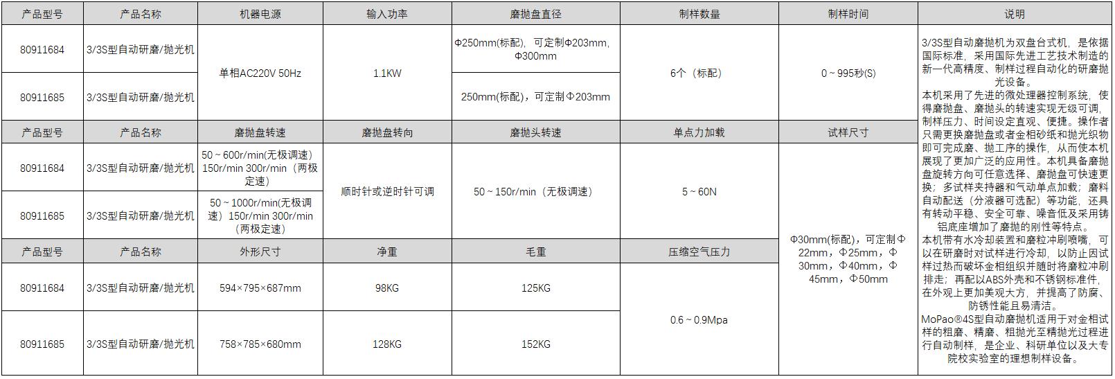 ·说明:3/3S型自动磨抛机为双盘台式机,是依据国际标准,采用国际先进工艺技术制造的新一代高精度、制样过程自动化的研磨抛光设备。