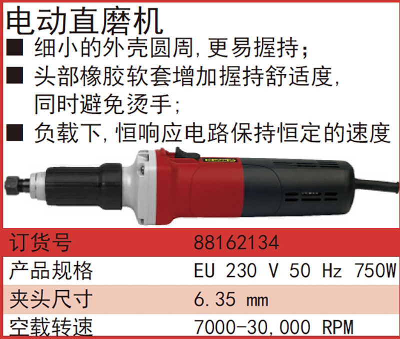 ·细小的外壳圆周,更易握持; ·头部橡胶软套增加握持舒适度,同时避免烫手; ·负载下,恒响应电路保持恒定的速度