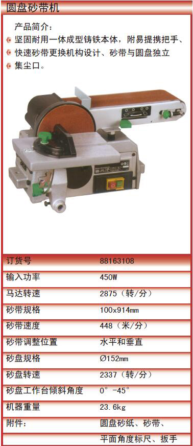 ·坚固耐用一体成型铸铁本体,附易提携把手、 快速砂带更换机构设计、砂带与圆盘独立 集尘口。