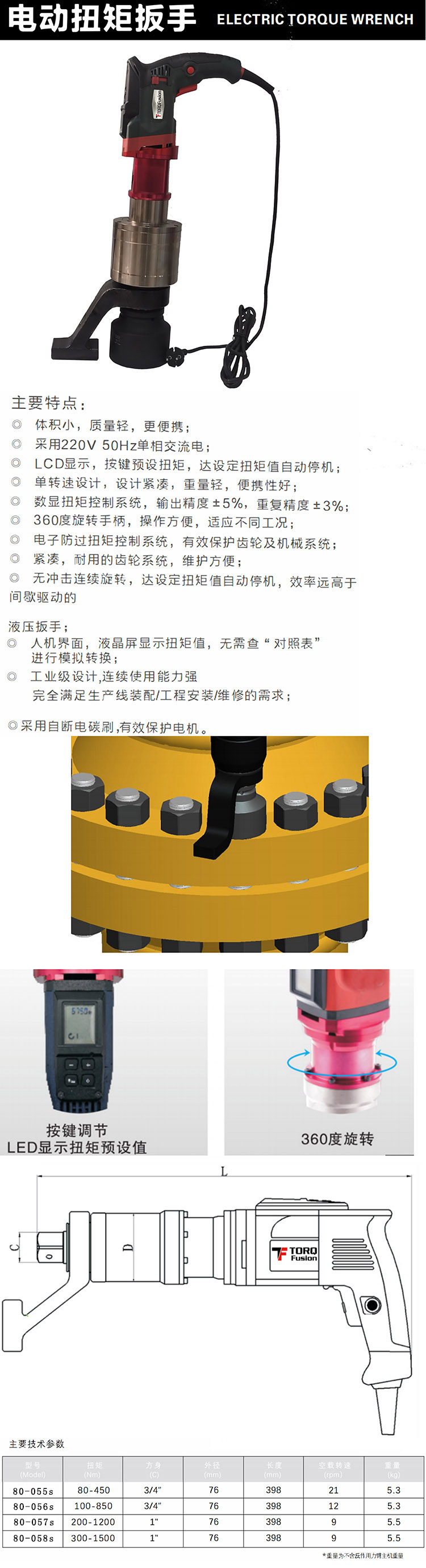 体积小 , 质量轻, 更便携;?  采用220V 50Hz单相交流电;? LCD显示, 按键预设扭矩, 达设定扭矩值自动停机;?  单转速设计 , 设计紧凑 , 重量轻, 便携性好;? 数显扭矩控制系统, 输出精度土5%, 重复精度士3%;? 360度旋转手柄, 操作方便, 适应不同工况;? 电子防过扭矩控制系统 , 有效保护齿轮及机械系统;?  紧凑, 耐用的齿轮系统 , 维护方便;? 无冲击连续旋转, 达设定扭矩值自动停机 , 效率远高于间歇驱动的” ? 人机界面 , 液晶屏显示扭矩值 , 无需查 对照表 ”进行模拟转换;? 工业级设计,连续使用能力强完全满足生产线装配/工程安装/维修的需求;? 采用自断电碳刷,有效保护电机。