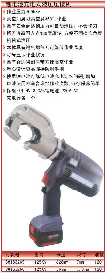 ·作业压力700bar真空油囊可高空及360°作业具有安全阀达到压力可自动泄压,不会卡刀切刀透露可左右180度旋转,方便不同操作角度机械式泄压本体具有进气排气孔可降低作业温度灯号显示作业状况具有舒适得到肩带方便高空作业 重心设计容易握持防滑手柄使用锂电池可降低电池充电记忆问题,增加电池使用寿命含增加作业次数,储存保养简单 ·标配:14.4V3.0Ah锂电池,230VAC充电器各一个
