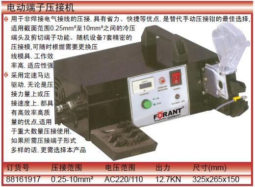 ·"用于非焊接电气接线的压接,具有省力、快捷等优点,是替代手动压接钳的最佳选择,适用截面范围0.25mm²至10mm²之间的冷压端头及剪切端子功能。随机设备7套精密的压接模,可随时根据需要更换压线模具,工作效率高,适应性强.采用定速马达 驱动,无论是压接力量上或压接速度上,都具有高效率高质量的优点,适用于重大数量压接使用,如果所需压接端子形式多样的话,更需选择本产品"