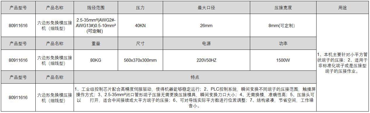 ·无需换模,准确性高;压接头可以完全打开,适合中间接续或大平方端子的压接;