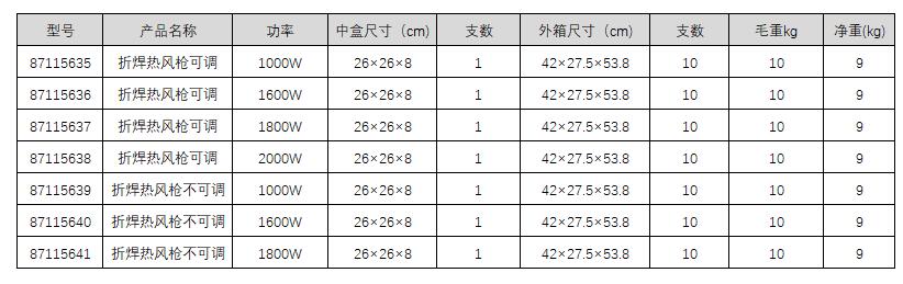 订货号 制造商型号 功率 温度 空气流量 标准附件 重量 中盒尺寸 支数 外箱尺寸 支数 毛重 价格 购物车