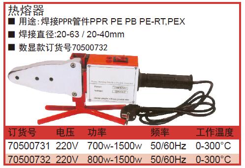 ·用途:焊接PPR管件PPRPEPBPE-RT,PEX ·焊接直径:20-63/20-40mm ·数显款订货号70500732