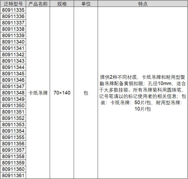 ·提供2种不同材质,卡纸吊牌和耐用型聚酯吊牌配备黄铜扣眼; ·孔径10mm。 ·所有吊牌菊科用圆珠笔、记号笔请以的标记使用者的相关信息; ·包装:卡纸吊牌:50片/包,耐用型吊牌:10片/包