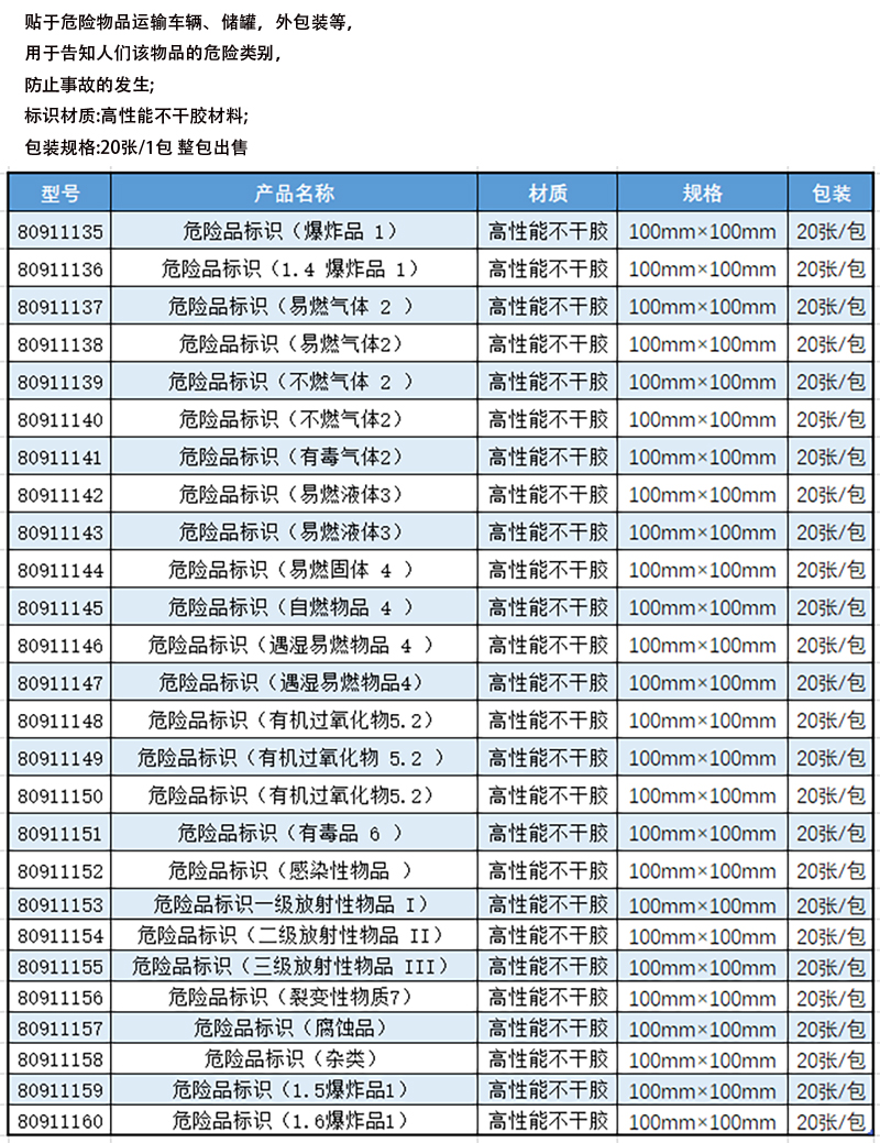 ·贴于危险物品运输车辆、储罐、外包装等; ·标识材质:高性能不干胶材料; ·包装规格:20张/包,整包出售