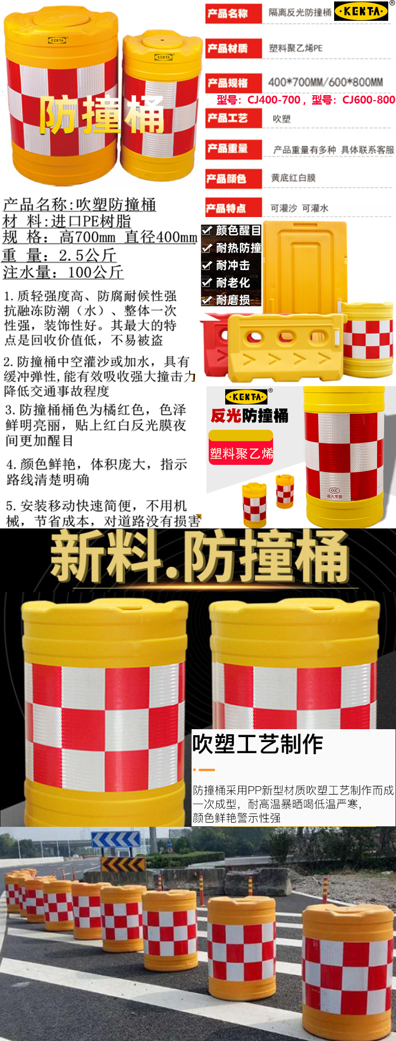 "1. 防撞桶中空灌沙,具有缓冲弹性,能有效吸收强大撞击力,降低交通事故程度;组合使用,整体承受力更强,更加稳固