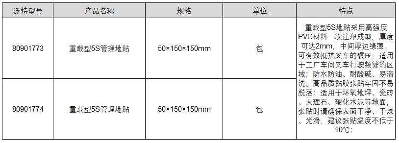 ·重载型5S地贴采用高强度PVC材料一次注塑成型,厚度可达2mm,中间厚边缘薄,可有效抵抗叉车的碾压,适用于工厂车间叉车行驶频繁的区域;