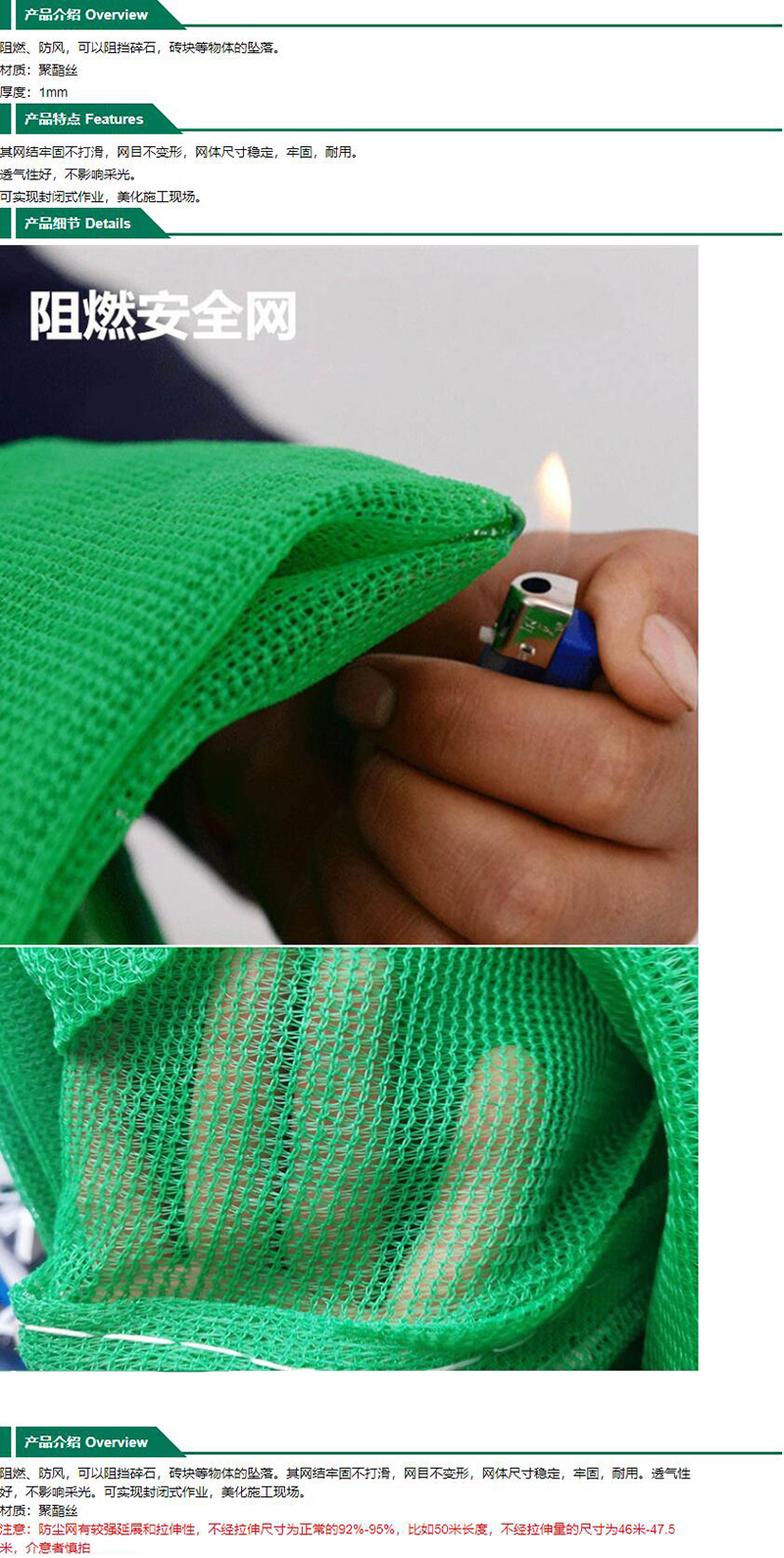 ·阻燃、防风,可以阻挡碎石,砖块等物体的坠落。 ·其网结牢固不打滑,网目不变形,网体尺寸稳定,牢固,耐用。 ·透气性好,不影响采光。 ·可实现封闭式作业,美化施工现场。