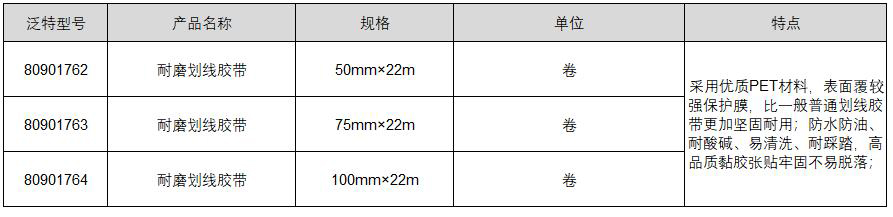 ·采用优质PET材料,表面覆超强保护膜,比一般普通划线胶带更加坚固耐用; ·防水防油、耐酸碱、易清洗、耐踩踏,高品质黏胶张贴牢固不易脱落;