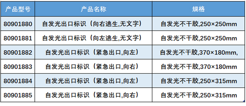 ·高性能自发光材料,发光时间长,确保灯光熄灭时安全出口清晰可见; ·提供自发光不干胶及板材两种材质