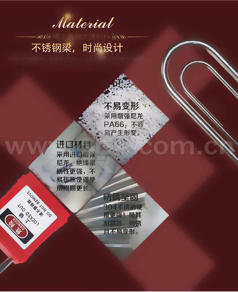 ·锁体由工程塑料尼龙PA制成,防紫外线,耐腐蚀,一体式设计,耐用,抗温差(-57℃~+177℃),抗冲击