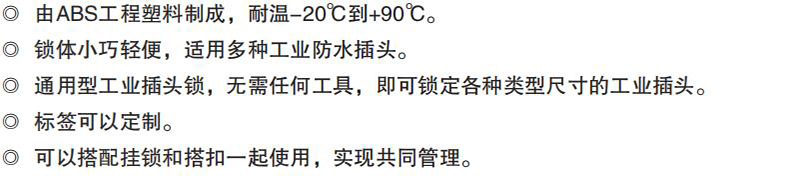 ·由ABS工程塑料制成,耐温-20℃到+90℃。锁体小巧轻便,适用多种工业防水插头。