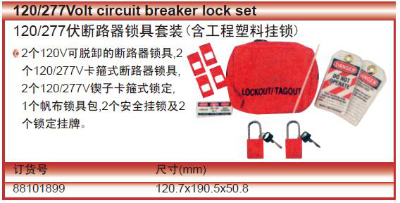 ·120/277伏断路器锁具套装(含工程塑料挂锁) ·产品特征:能够包住电源插头可防止意外重接 ·独特旋转设计,便于在狭窄的空间里安装每个订货号可以旋转为最小空间放入安全工具箱 ·贴有高清晰永久安全标签(中文/英文),标签可以写上负责人名字,然后擦去以备下一次工作 ·高强度绝缘热塑性塑料可耐化学制品,在极端条件(温度范围-46℃到177℃)下均可有效工作 ·注意事项:产品不含挂锁 ·可容纳挂锁的数量 :2个 ·锁孔直径: 8mm ·88101897适合电源插头的最大直径:13mm ·88101898适合电源插头的最大直径:25mm ·2个120V可脱卸的断路器锁具,2个120/277V卡箍式断路器锁具,2个120/277V锲子卡箍式锁定,1个帆布锁具包,2个安全挂锁及2个锁定挂牌。
