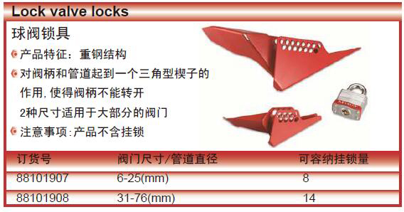 ·产品特征:重钢结构对阀柄和管道起到一个三角型楔子的作用,使得阀柄不能转开 ·2种尺寸适用于大部分的阀门 ·注意事项:产品不含挂锁