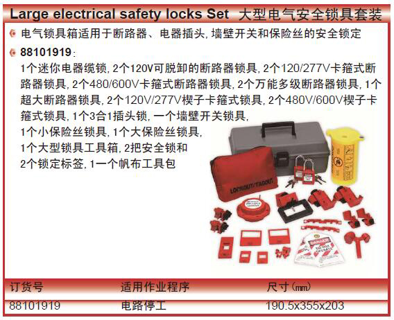 ·电气锁具箱适用于断路器、电器插头,墙壁开关和保险丝的安全锁定88101919:1个迷你电器缆锁,2个120V可脱卸的断路器锁具,2个120/277V卡箍式断路器锁具,2个480/600V卡箍式断路器锁具,2个万能多级断路器锁具,1个超大断路器锁具,2个120V/277V楔子卡箍式锁具,2个480V/600V楔子卡箍式锁具,1个3合1插头锁,一个墙壁开关锁具,