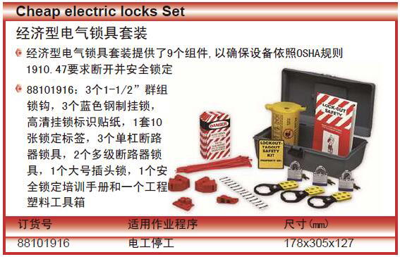 ·经济型电气锁具套装提供了9个组件,以确保设备依照OSHA规则1910.47要求断开并安全锁定 ·88101916:3个1-1/2”群组锁钩,3个蓝色钢制挂锁,高清挂锁标识贴纸,1套10张锁定标签,3个单杠断路器锁具,2个多级断路器锁具,1个大号插头锁,1个安全锁定培训手册和一个工程塑料工具箱