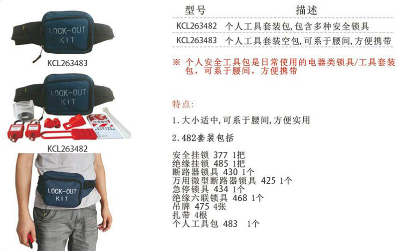 ·个人安全工具包是日常使用的电器类锁具/工具套装包,可系于腰间,方便携带