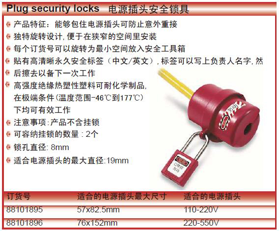·产品特征:能够包住电源插头可防止意外重接独特旋转设计,便于在狭窄的空间里安装 ·每个订货号可以旋转为最小空间放入安全工具箱贴有高清晰永久安全标签(中文/英文),标签可以写上负责人名字,然后擦去以备下一次工作 ·高强度绝缘热塑性塑料可耐化学制品,在极端条件(温度范围-46℃到177℃)下均可有效工作 ·注意事项:产品不含挂锁 ·可容纳挂锁的数量 :2个 ·锁孔直径: 8mm ·88101897适合电源插 ·头的最大直径:13mm ·88101898适合电源插 ·头的最大直径:25mm ·2个120V可脱卸的断路器锁具,2个120/277V卡箍式断路器锁具, ·2个120/277V锲子卡箍式锁定, ·1个帆布锁具包,2个安全挂锁及2个锁定挂牌。 ·可容纳挂锁的数量 : 2个 ·锁孔直径: 8mm ·适合电源插头的最大直径:19mm