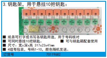 ·纸条可打字或书写各钥匙用途,用于号码核对 ·可同时悬挂10把钥匙。可与钥匙箱配套使用 ·尺寸:宽×深×高317×23×41mm ·4组每包装,号码1-10,颜色随机发送。