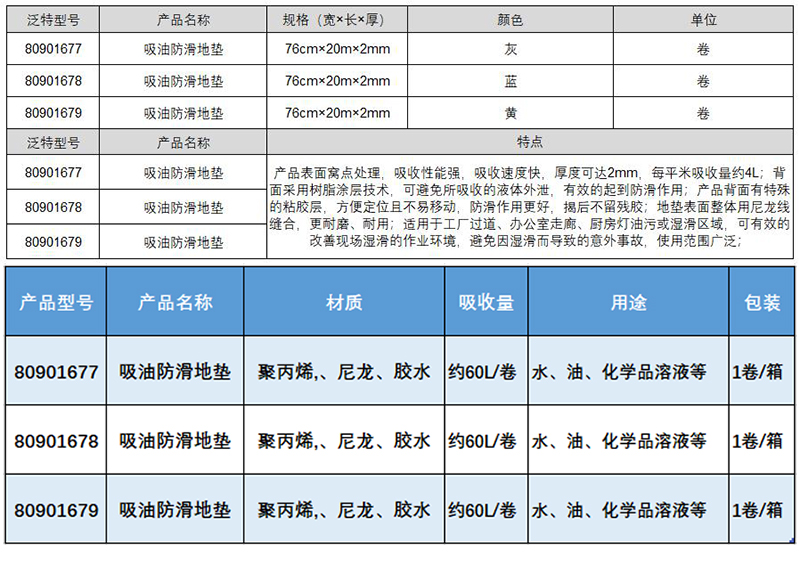 ·产品表面窝点处理,吸收性能强,吸收速度快,厚度可达2mm,每平米吸收量约4L; ·背面采用树脂涂层技术,可避免所吸收的液体外泄,有效的起到防滑作用; ·产品背面有特殊的粘胶层,方便定位且不易移动,防滑作用更好,揭后不留残胶;地垫表面整体用尼龙线缝合,更耐磨、耐用;