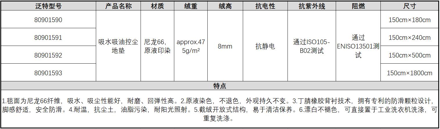 ·毯面为100%尼龙66纤维,吸水、吸尘性能好,耐磨、回弹性高。