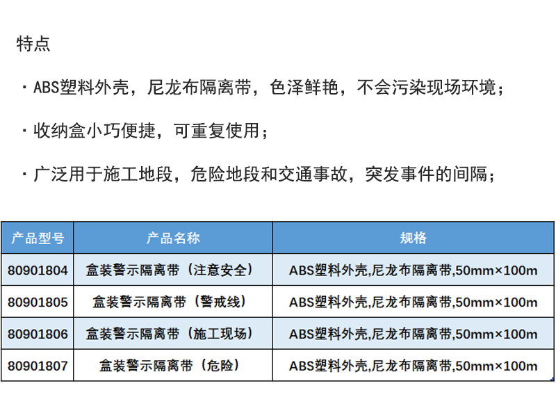 ·ABS塑料外壳,尼龙布隔离带,色泽鲜艳,不会污染现场环境; ·收纳盒小巧便捷,可重复使用; ·广泛用于施工地段,危险地段和交通事故,突发事件的间隔;