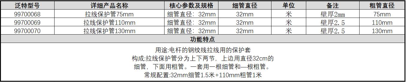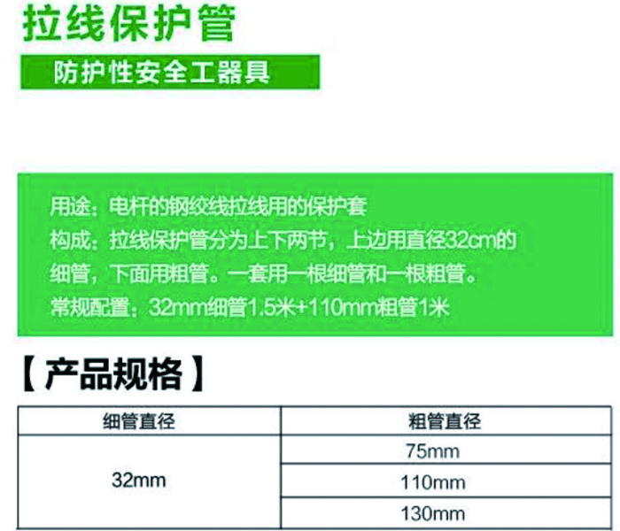 ·用途:电杆的钢绞线拉线用的保护套 构成;拉线保护管分为上下两节,上边用直径32cm的 细管,下面用粗管。一套用一根细管和—根粗管。 常规配置:32mm细管1.5米+110mm粗管1米