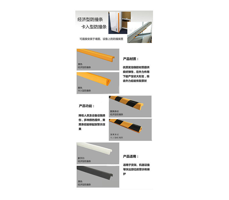 ·该产品对于员工及设施设备有很好的保护作用,可避免员工因疏忽而造成不必要的受伤 ·适合对各类货架、机器设备边缘、墙角进行保护 ·独特黄黑条纹使得警示效果更佳 ·安装简便