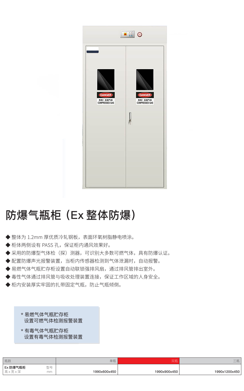 ·此款气瓶柜不带报警功能; ·全钢气瓶柜,可储存氮气、氧气、多种惰性气体; ·柜体采用加厚优质冷轧钢板,酸洗磷化处理; ·表面通过环氧树脂静电喷涂,达到防酸碱及防锈的效果;