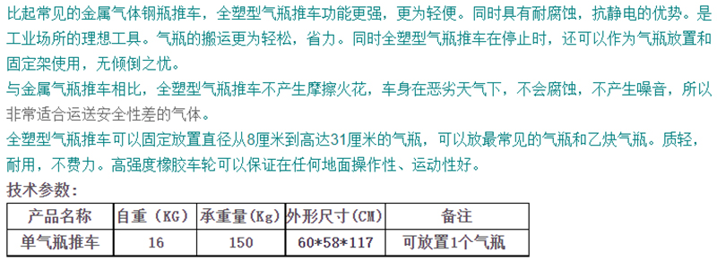 ·比起常见的金属气体钢瓶推车,全塑型气瓶推车功能更强,更为轻便 ·同时具有耐腐蚀,抗静电的优势 ·是工业场所的理想工具 ·气瓶的搬运更为轻松,省力 ·同时全塑型气瓶推车在停止时,还可以作为气瓶放置和固定架使用,无倾倒之忧。