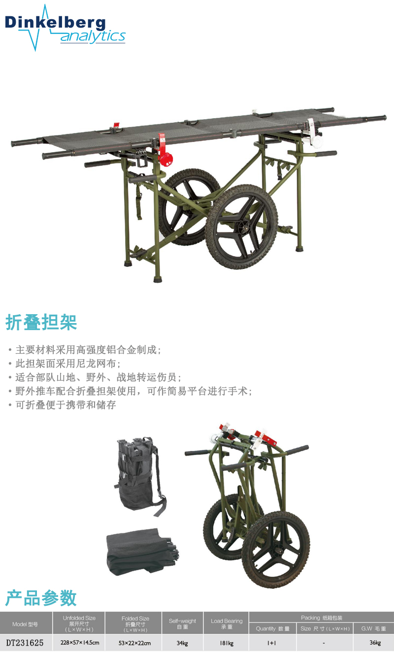 ·主要材料采用高强度铝合金制成 ·此担架面采用尼龙网布; ·适合部队山地、野外、战地转运伤员;野外推车配合折叠担架使用,可作·简易平台进行手术; ·可折叠便于携带和储存。