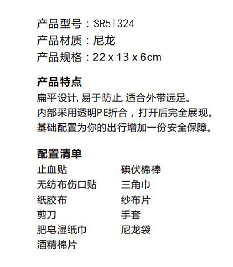 ·此产品内设拖车绳、安全锤、晕车贴及常用急救医疗护理用品。 ·适用于驾乘者出行时发生紧急状况时使用,为车主及随车人员提供安全保障。