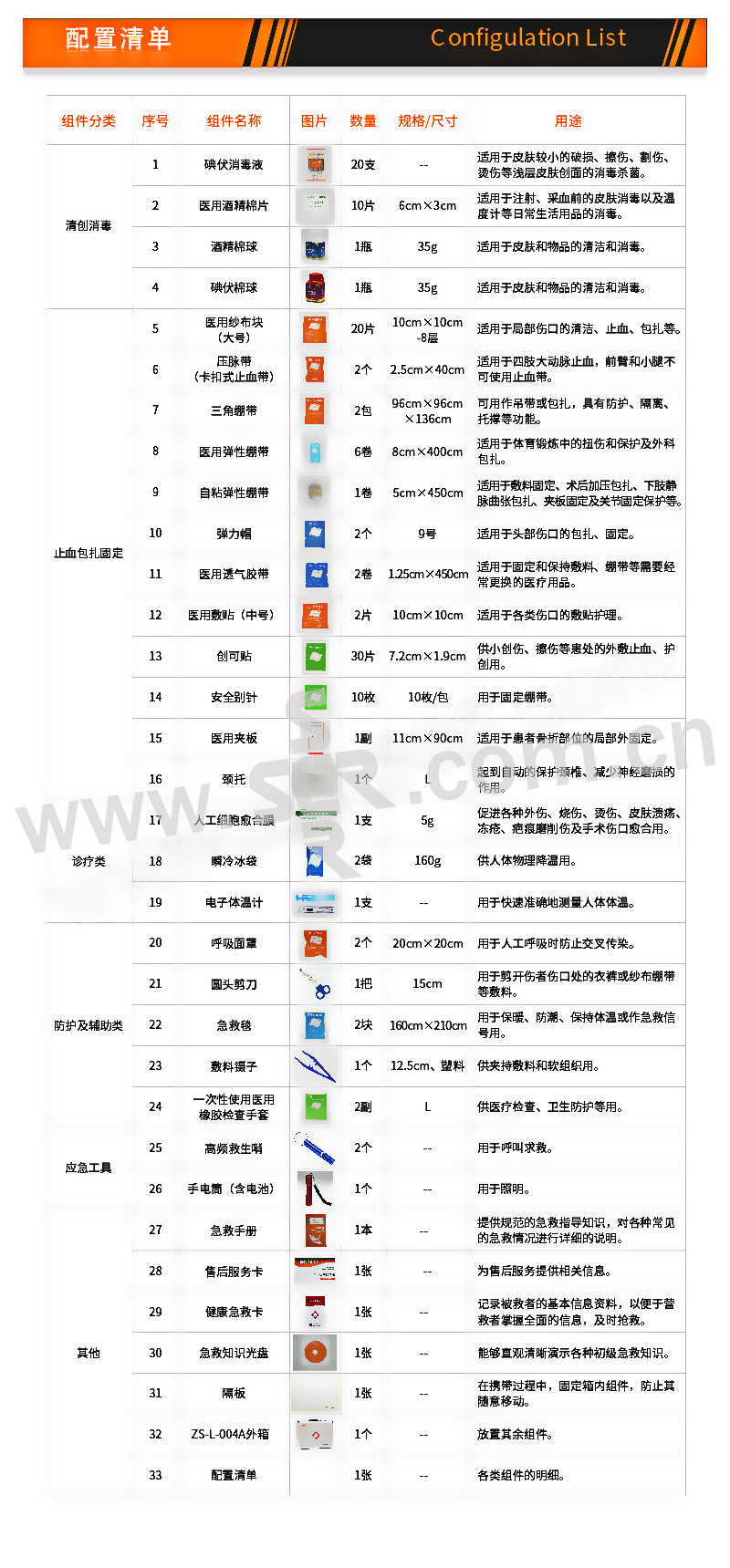 ·侧重于院前急救所需的医疗器械产品。 ·解决人体伤害发生及时进行清创消毒、止血包扎、肢体固定、移送观察,创伤愈合等护理需求。·规格尺寸:450mm×340mm×145mm·外观颜色:银白色·适用人数:10—20人