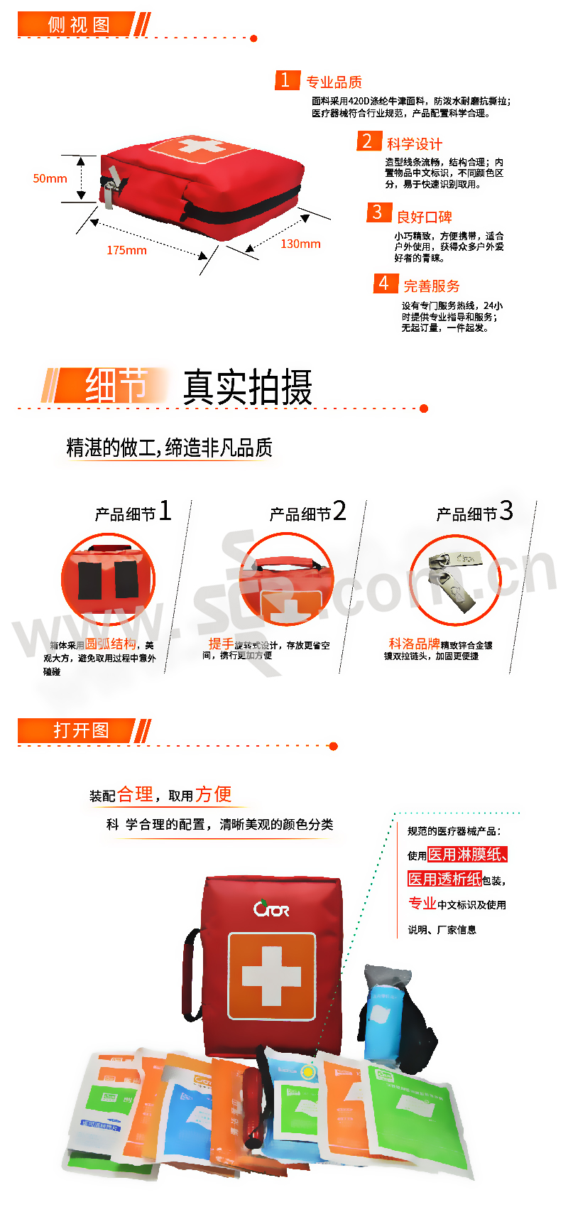 · 红色的外观设计使急救包更加显眼,贴合户外工作和户外运动的特性。