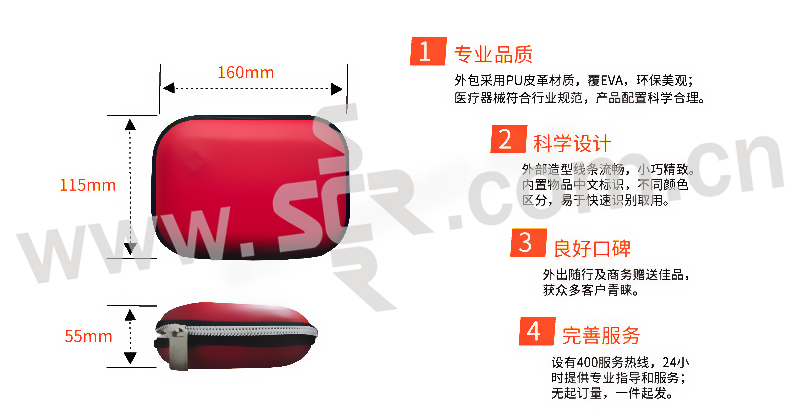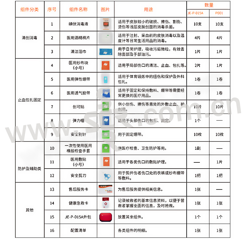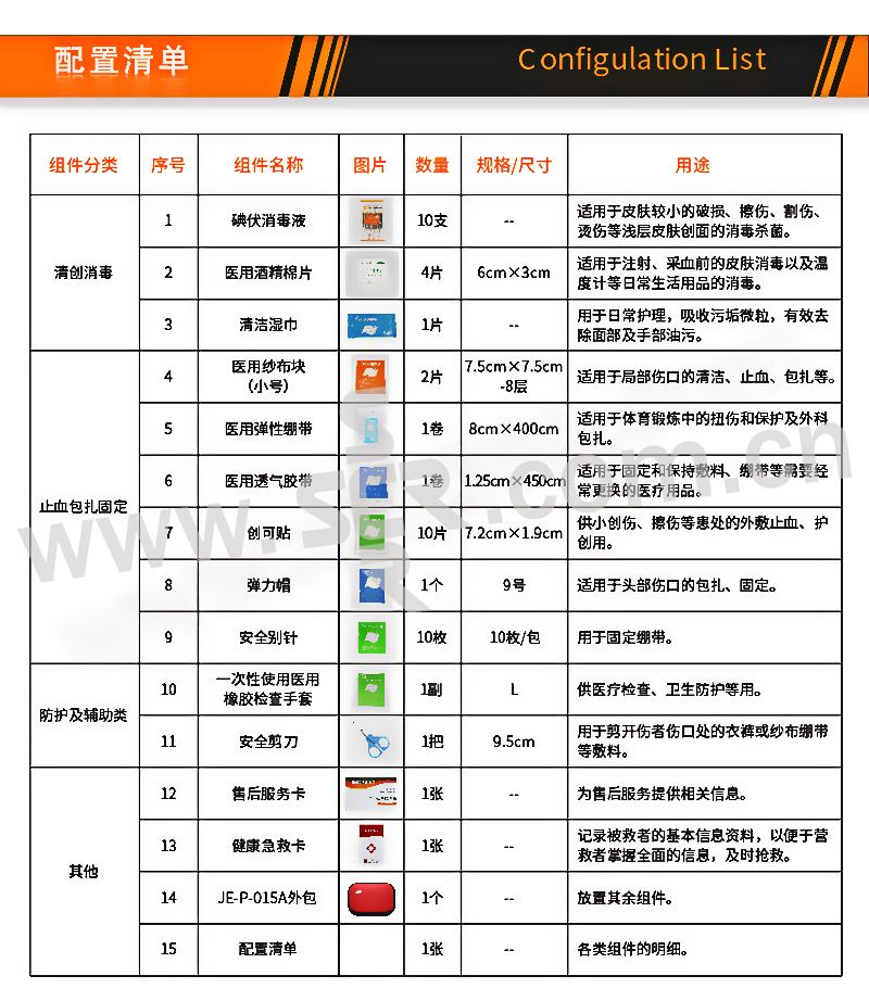 ·医用纱布块×2,医用弹性绷带×1,创可贴×10,医用透气胶带×1,碘伏棉棒×10,弹力帽×1,一次性使用医用橡胶检查手套×1,医用酒精棉片×4,清洁湿巾×1,安全别针×10,安全剪刀×1,健康急救卡×1,售后服务卡×1,外包×1,配置清单×1,·内置医疗用品可供消毒清创、止血包扎的初步处理,针对出行时发生意外伤害时快速便携使用。