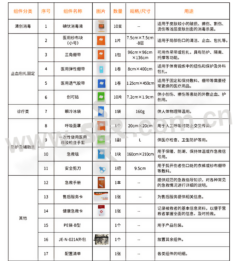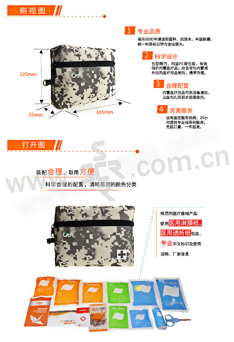 ·内置医疗用品可供消毒清创、止血包扎的初步处理,能满足日常生活中常见的伤害处理。