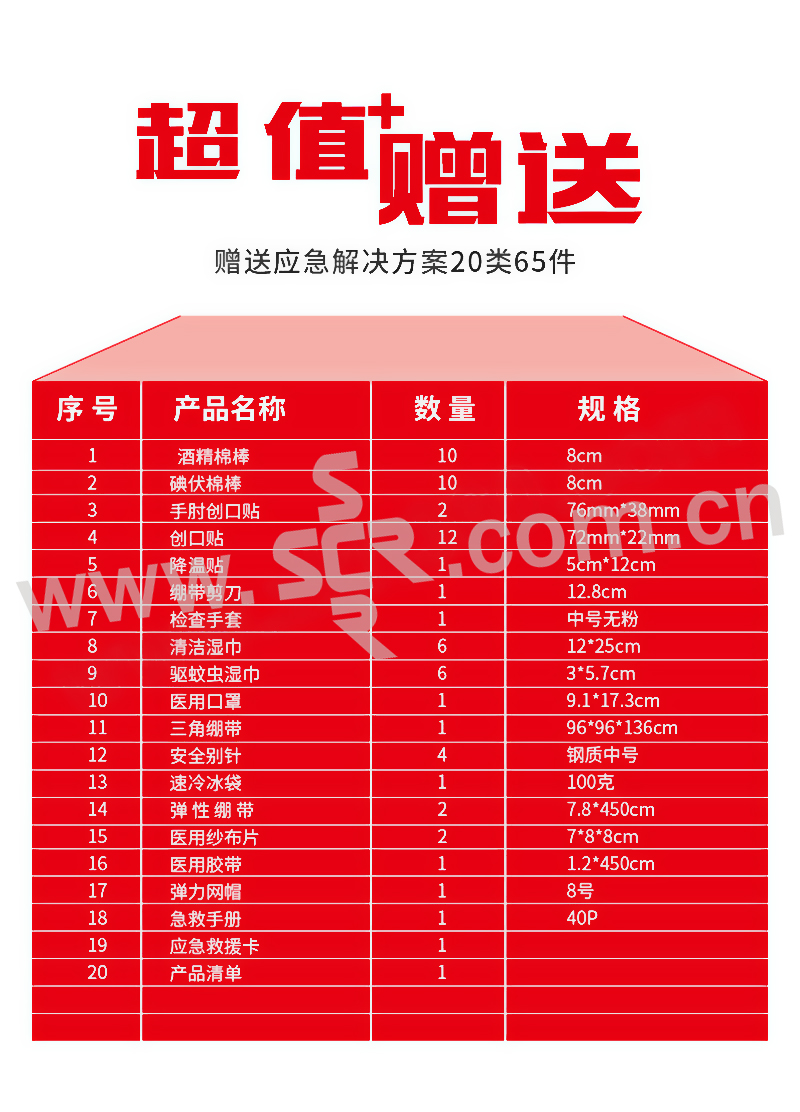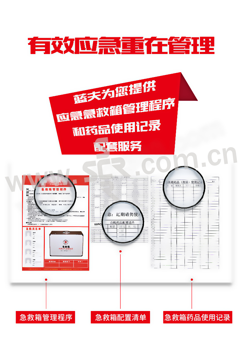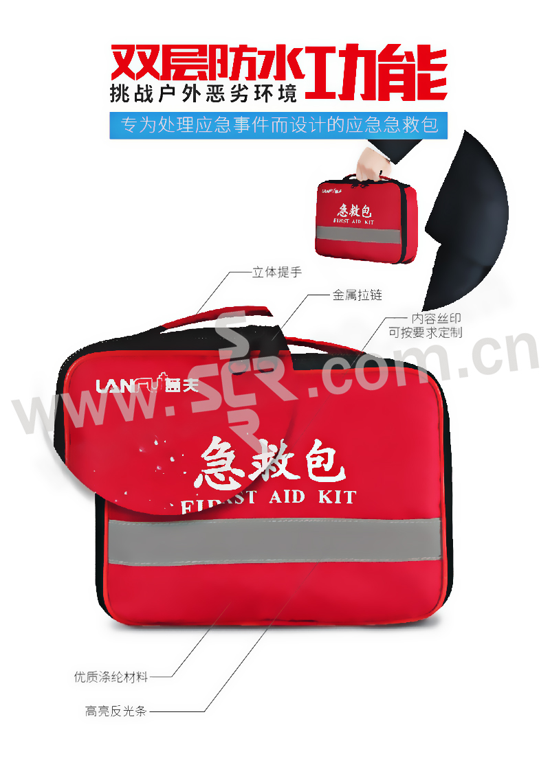 ·采用牛津布制作,主要有消毒清创、伤口包扎、防护隔离、降温冷敷等功能及其它器具