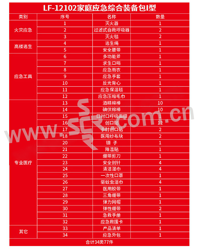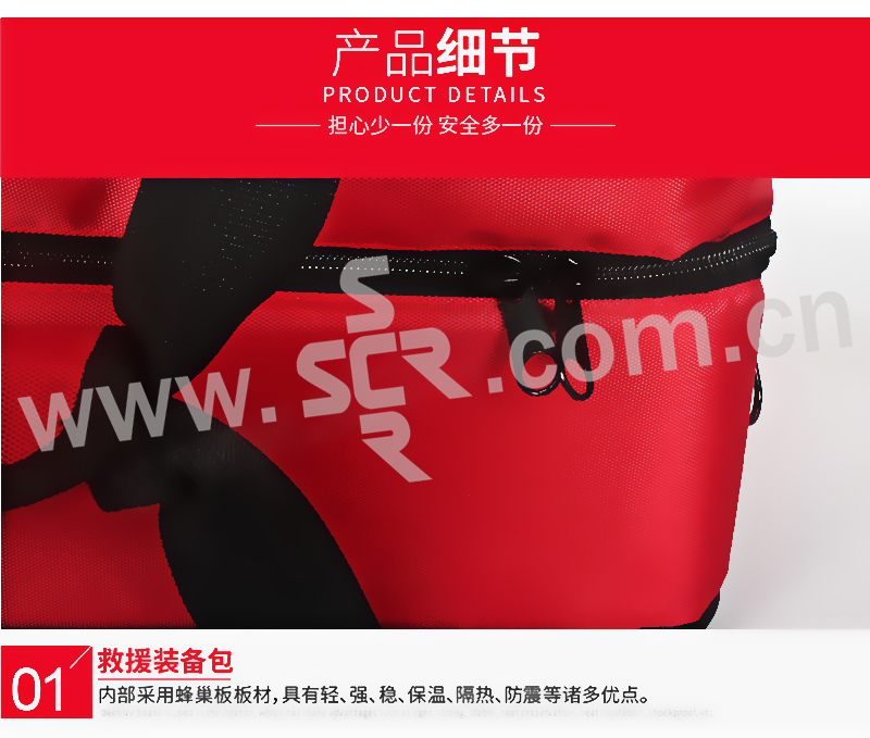 ·采用优质尼龙材料精工制作,内置蜂巢板用于抗压防震,外包整齐大方,单肩手提设计。应急物品取放简捷快速。内容设置:人体红外感应应急光源、火情处置、呼吸防护、应急工具、高楼逃生、急救医疗六项主要功能。主要针对家庭环境下处置应急事件的特点配置。