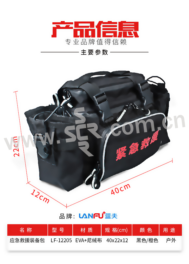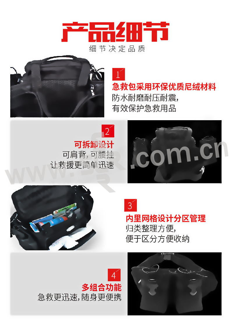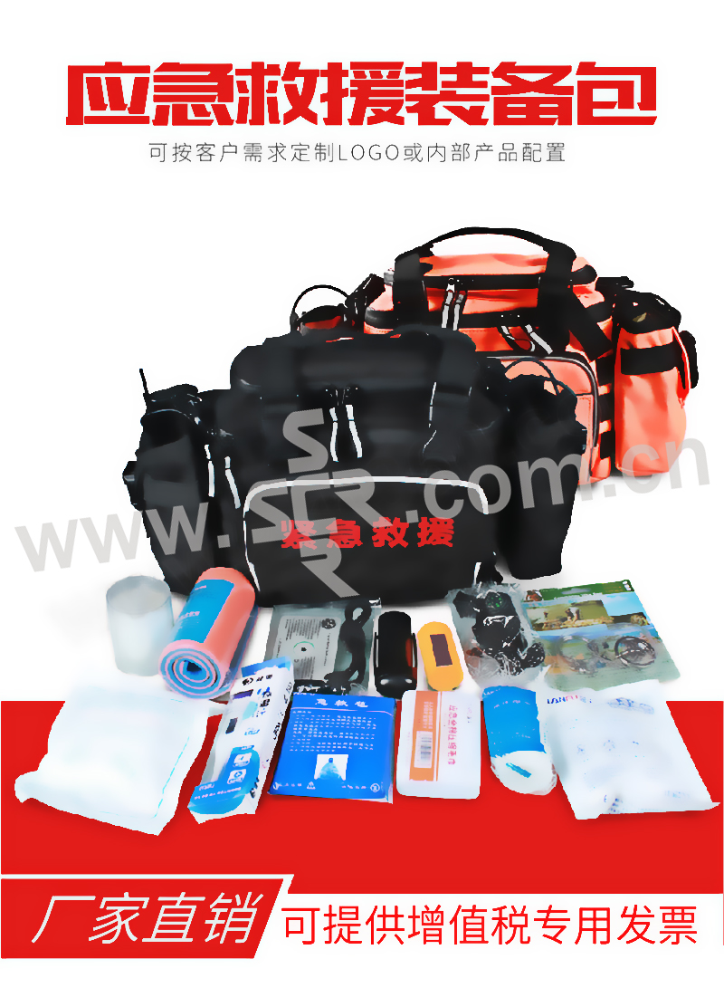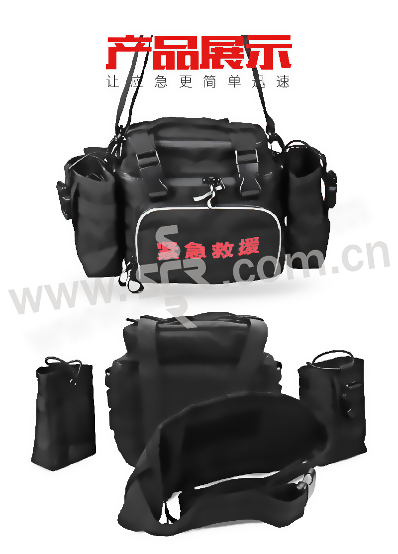 ·采用环保优质的尼龙材料,防水耐磨耐压耐震,有效保护急救用品。主要包括:应急救援、消毒清创、伤口包扎、降温冷敷等功能。