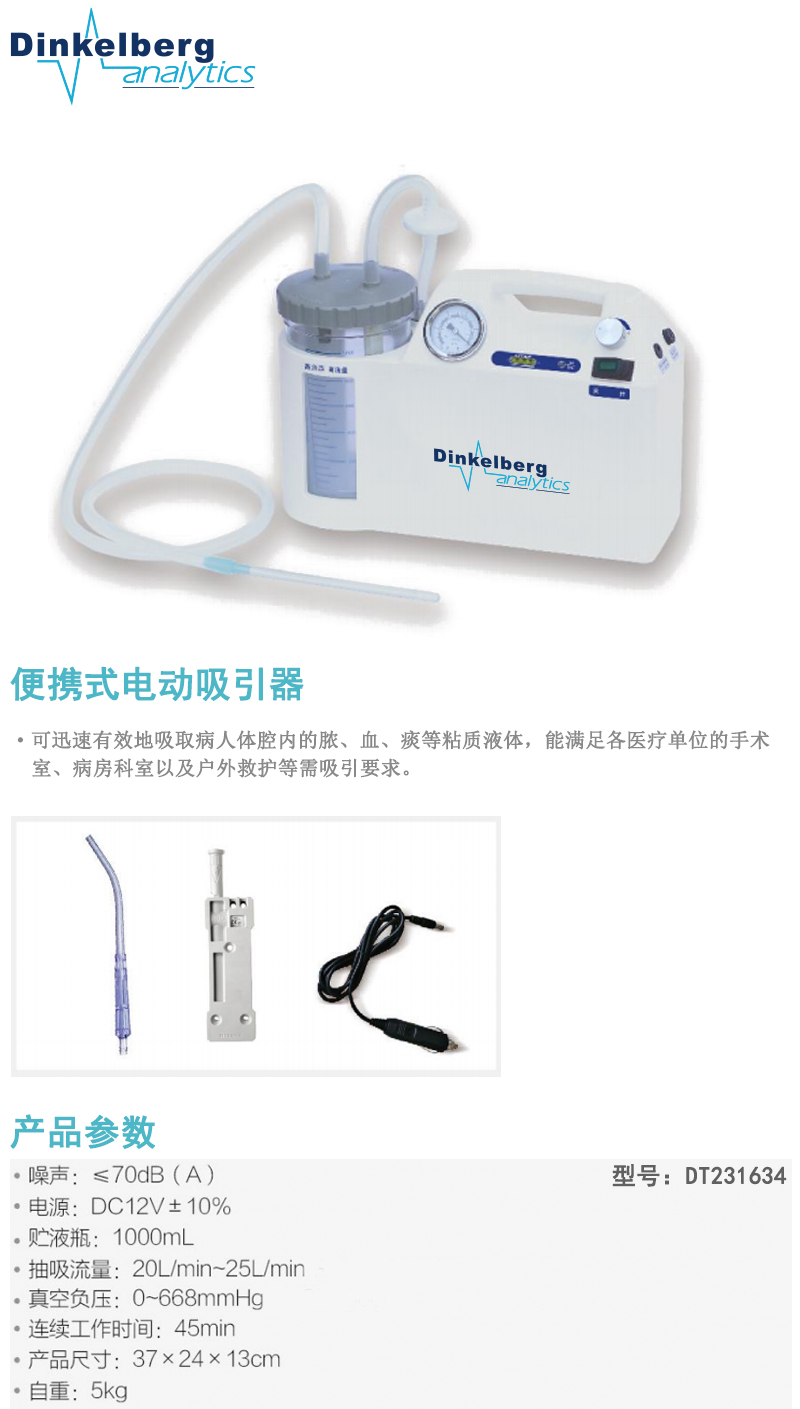 ·本便携式电动吸引器可迅速有效地吸取病人体腔内的脓、血、痰等粘质液体,能满足各医疗单位的手术室、病房科室以及户外救护等吸引要求。 ·电池12V/5Ah,也可配合车载电源DC12V使用。