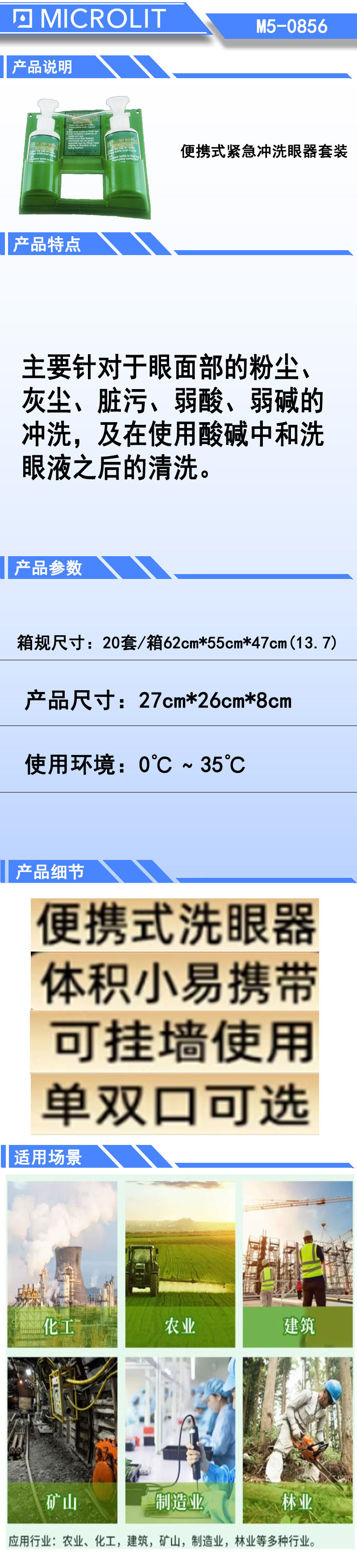 * 主要针对于眼面部的粉尘、灰尘、脏污、弱酸弱碱的冲洗,及在使用酸碱中和洗眼液之后的清洗。