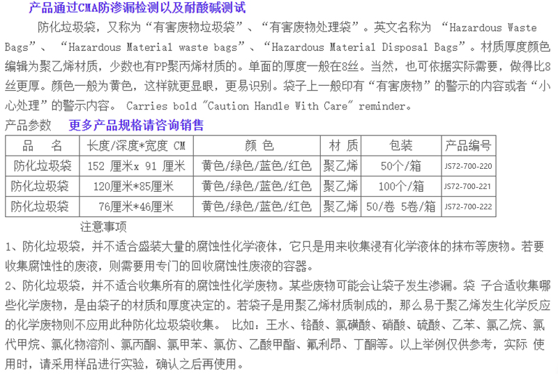 ·颜色一般为黄色,这样就更显眼,更易识别。袋子上一般印有“有害废物”的警示的内容或者“小心处理”的警示内容。
