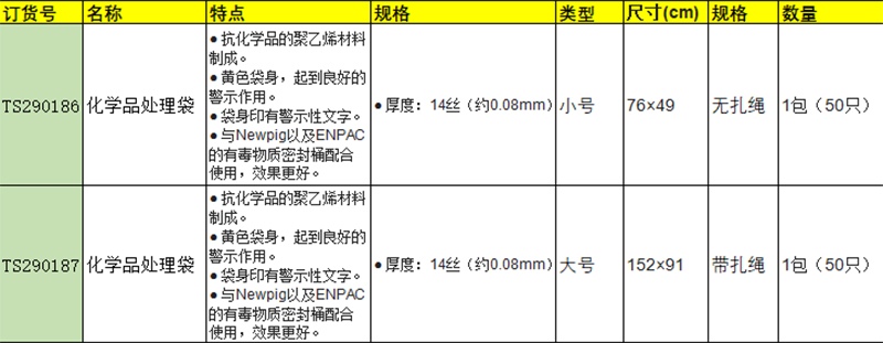 · 抗化学品的聚乙烯材料制成。 · 黄色袋身,起到良好的警示作用。 · 袋身印有警示性文字。 · 与Newpig以及ENPAC的有毒物质密封桶配合使用,效果更好。