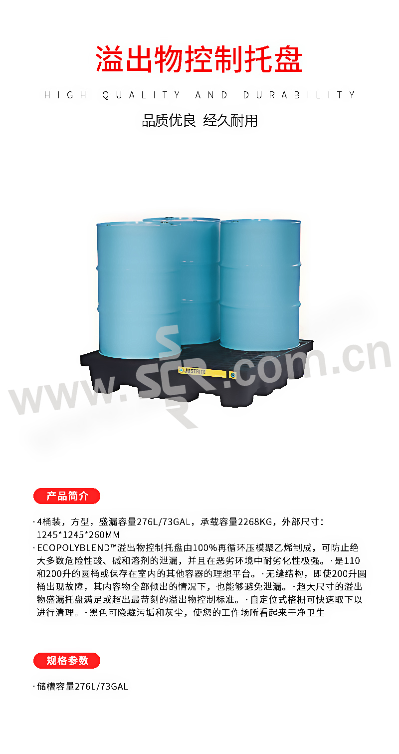 ·4桶装,方型,盛漏容量276L/73GAL,承载容量2268kg,外部尺寸:1245*1245*260mm。·EcoPolyBlend™溢出物控制托盘由100%再循环压模聚乙烯制成,可防止绝大多数危险性酸、碱和溶剂的泄漏,并且在恶劣环境中耐劣化性极强。·是110和200升的圆桶或保存在室内的其他容器的理想平台。·无缝结构,即使200升圆桶出现故障,其内容物全部倾出的情况下,也能够避免泄漏。·超大尺寸的溢出物盛漏托盘满足或超出最苛刻的溢出物控制标准。·自定位式格栅可快速取下以进行清理。·黑色可隐藏污垢和灰尘,使您的工作场所看起来干净卫生。