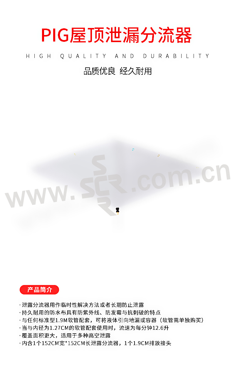 ·泄露分流器用作临时性解决方法或者长期防止泄露·持久耐用的防水布具有防紫外线、防发霉与抗刺破的特点·与任何标准型1.9m软管配套,可将液体引向地漏或容器(软管需单独购买)·当与内径为1.27cm的软管配套使用时,流速为每分钟12.6升·覆盖面积更大,适用于多种高空泄露·内含1个152cm宽*152cm长泄露分流器,1个1.9cm排放接头