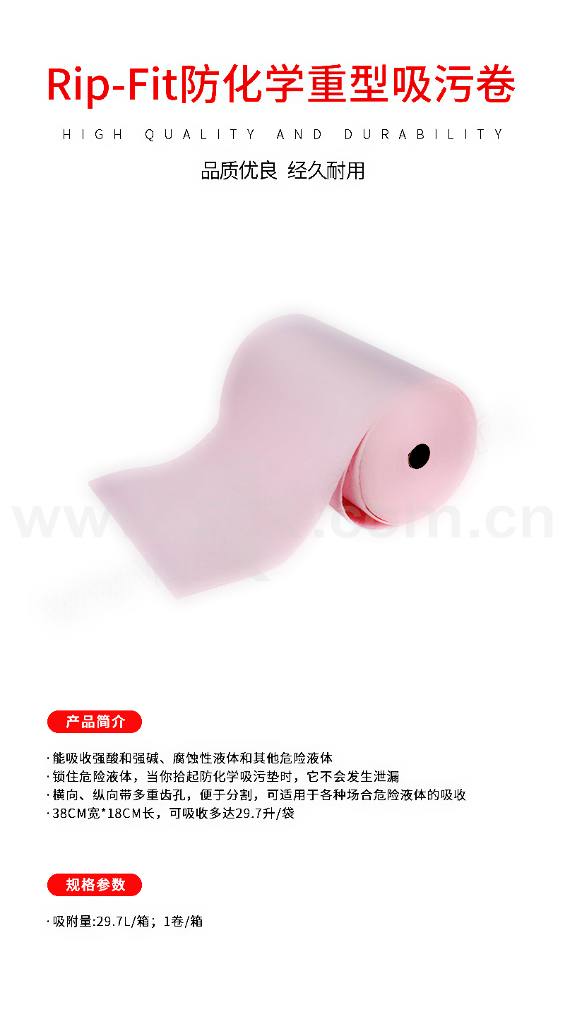 ·能吸收强酸和强碱、腐蚀性液体和其他危险液体·锁住危险液体,当你拾起防化学吸污垫时,它不会发生泄漏·横向、纵向带多重齿孔,便于分割,可适用于各种场合危险液体的吸收·38cm宽*18cm长,可吸收多达29.7升/袋