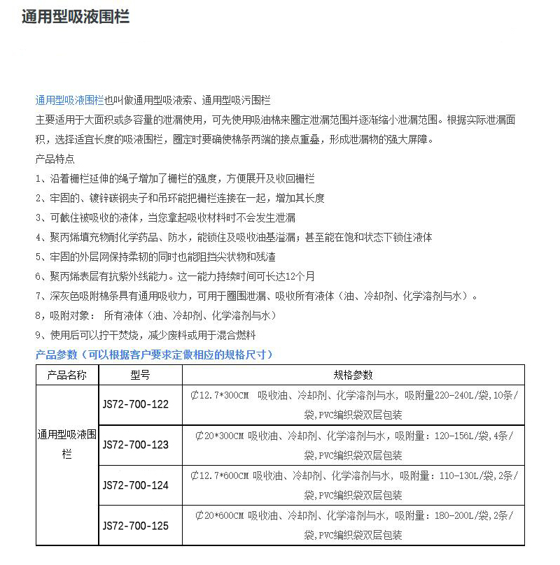 ·沿着栅栏延伸的绳子增加了栅栏的强度,方便展开及收回栅栏 ·牢固的、镀锌碳钢夹子和吊环能把栅栏连接在一起,增加其长度 ·可截住被吸收的液体,当您享起吸收材料时不会发生泄漏 ·聚丙烯填充物耐化学药品、防水,能锁住及吸收油基溢漏;甚至能在饱和状态下锁住液体 ·牢固的外层网保持柔韧的同时也能阻挡尖状物和残渣 ·聚丙烯表层有抗紫外线能力。这一能力持续时间可长达12个月 ·深灰色吸附棉条具有通用吸收力,可用于圈围泄漏、吸收所有液体(油、冷却剂、化学溶剂与水)。 ·吸附对象:所有液体(油、冷却剂、化学溶剂与水) ·使用后可以拧干焚烧,减少废料或用于混合燃料